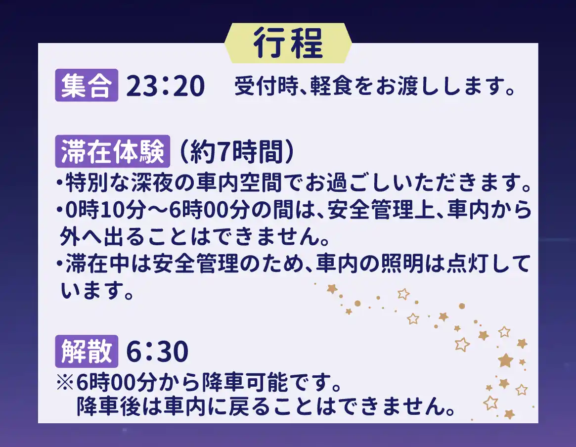 本企画は深夜に鉄道車両の車内で過ごしていただくという、特別な空間や雰囲気を味わっていただくイベントです。 |