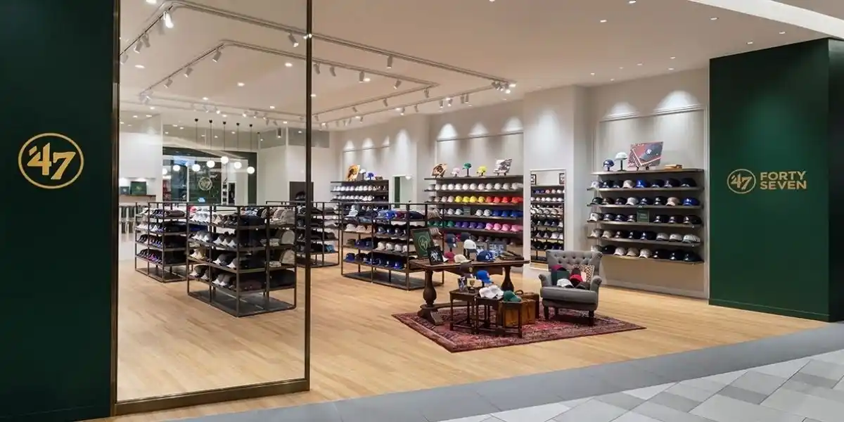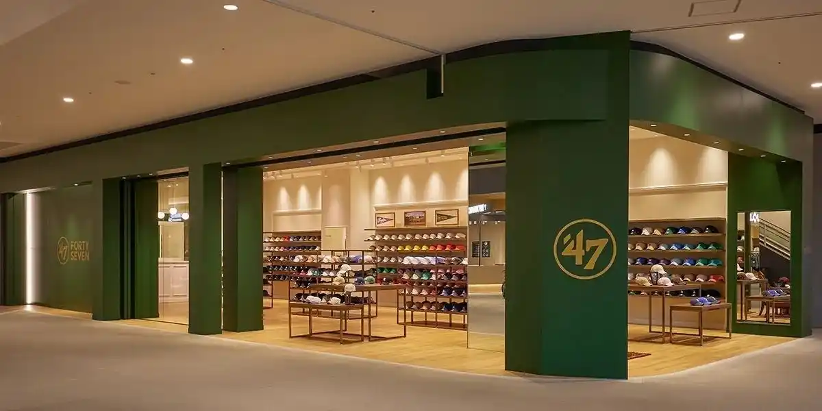 ’47沖縄は、2025年12月にオープンした九州・沖縄地区初出店の店舗です。深みのあるグリーンを基調に、落ち着いたゴールドのブランドロゴをあしらった印象的なエントランスを設けています。店内は、オフホワイトの壁とウッド調の床、ステンレスとマホガニー調の什器により、ナチュラルかつクリーンでありながら、アクティブで華やかな’47のブランドイメージを表現しています。また、エントランス正面にはヴィンテージの什器を配置し、ブランドの世界観とシーズン性を感じていただけるディスプレイを常に展開いたします。 |
