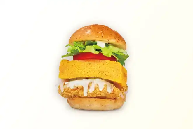 「厚焼き玉子チキンバーガー」は、だしの旨味と程よい甘みが広がる厚焼き玉子に、ジューシーなチキンを組み合わせた一品。ふっくらとした食感とやさしい味わいが特徴で、わさびソースをあわせることでこれまでにない和風テイストのチキンバーガーとしてお楽しみいただけます。 |