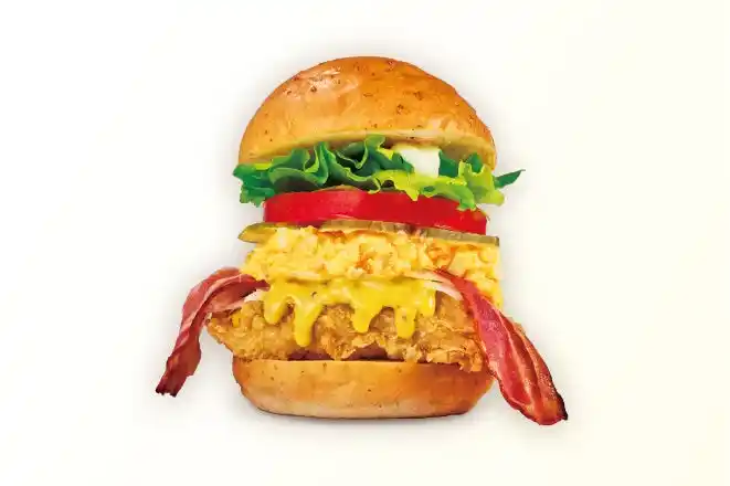「BLTエッグチキンバーガー」は、やわらかな食感で卵の風味が引き立つたまごフィリングに、ベーコン・レタス・トマトを合わせ、ハニマソースをかけたチキンと一緒に挟んだBLT仕立て。たまごのコクが加わることで、全体の味わいに深みをプラスしています。 |