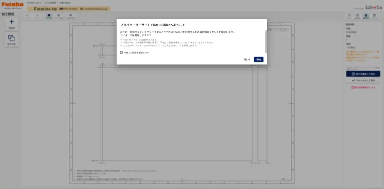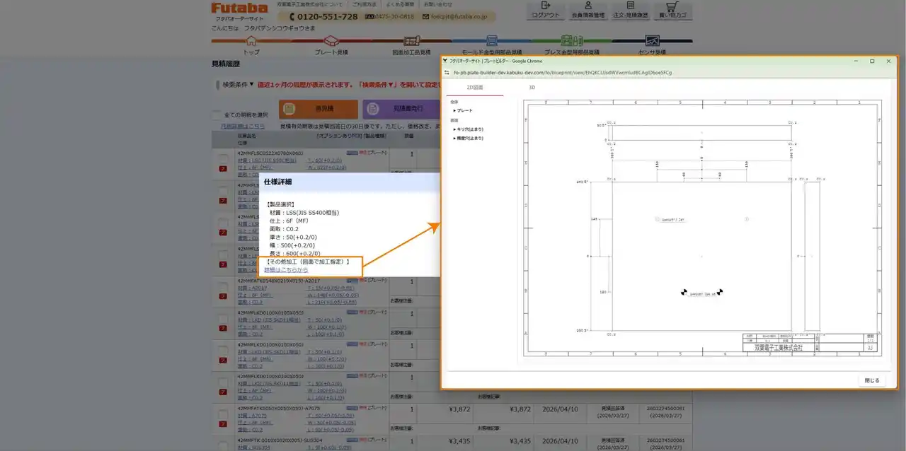 生産器材ECサイト「フタバオーダーサイト」のプレート見積よりご利用いただけるサービスで、任意の二次加工をブラウザ上で簡易的にご指定、調達できるサービスです。加工入力の後、見積り金額が即時に算出されます。 |