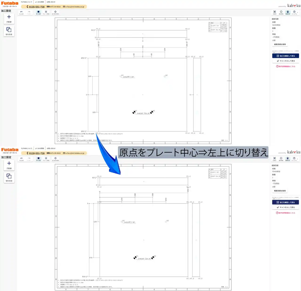 サービス開始以降、数多くの皆さまにご利用頂いておりますが、従来のPlate Builderは左上のみの原点設定でございましたため、原点の異なる図面を基に入力される場合は、加工位置を左上に置き換えた場合の座標を計算してからご入力いただく必要がございました。 |