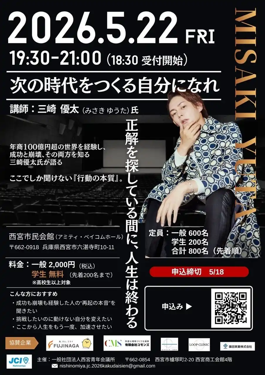 一般社団法人西宮青年会議所(理事長:林 大輔、所在地:兵庫県西宮市櫨塚町2-20 西宮商工会館4階)は、2026年5月22日(金)、西宮市民会館(アミティ・ベイコムホール)にて、実業家・三崎優太氏(三崎未来ホールディングス株式会社 代表取締役社長)を講師に迎えた5月度公開例会『次の時代をつくる自分になれ ~正解を探している間に、人生は終わる~』を開催いたします。 本講演会は、現代の「正解が見えない時代」において、不安を抱えながらも一歩を踏み出したいと願う社会人、学生、若手経営者に向け、三崎氏の波乱万丈な実体験に基づく 「行動の仕組み」を伝えるものです。 |
