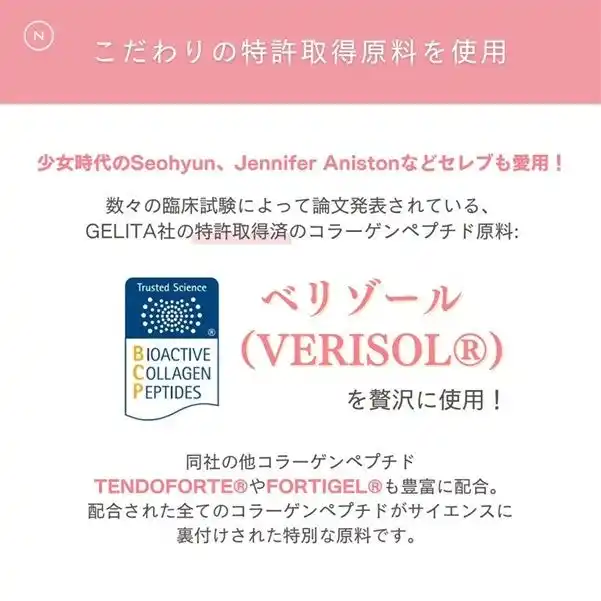 セレブも愛用するGelita社(ドイツ)の特許取得コラーゲン原料を使用 |