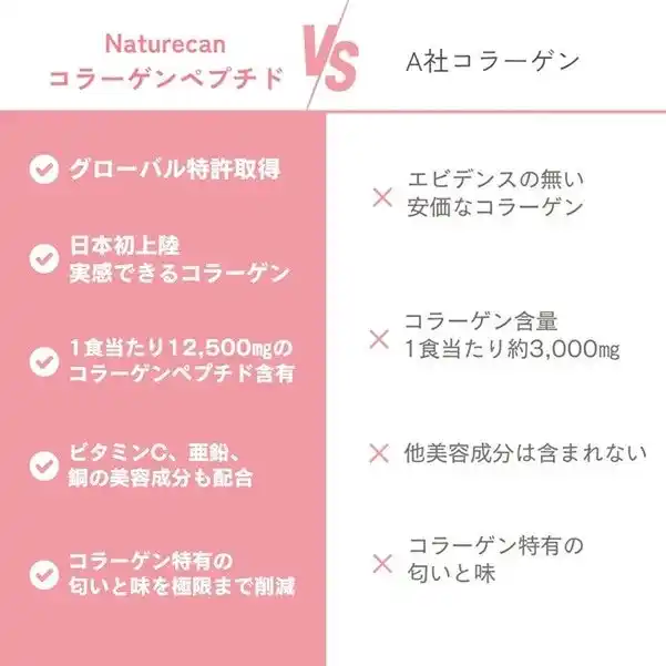 Naturecanのコラーゲンペプチドには、1食分あたり12500mgのコラーゲンペプチドに加えて、亜鉛・ビタミンC・銅の3種類の美容成分を配合。