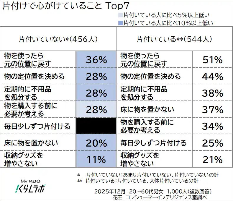 片付けで心がけていることを聞くと、上位に挙がる項目には片付いている人もそうでない人も大きな差はありません。一方で『片付いていない』人は、『片付いている』人に比べて、「使ったら元の位置に戻す」「定位置を決める」「定期的に不用品を処分」などを意識する割合が10%以上低いという結果でした。さらに、「物を購入する前に必要か考える」「床に物を置かない」「収納グッズを増やさない」などの意識も低いことが分かりました。 |
