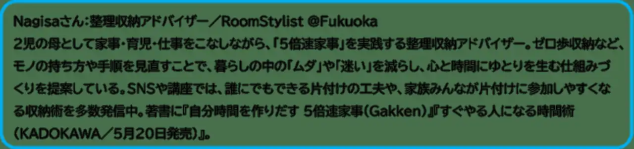 ▶My Kaoくらしラボ 「忙しい毎日でも続く片付けのヒント Nagisaさんの「5倍速家事」に学ぶ暮らしの整え方」 (2026年4月掲載) |