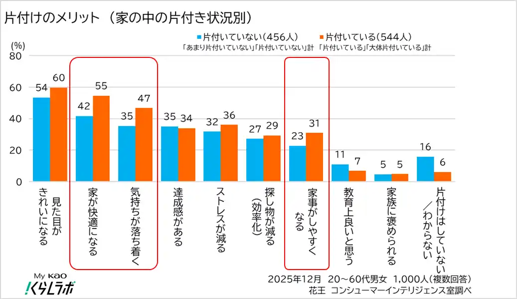 花王株式会社では、暮らしに関わる様々な調査を行っています。家の中の片付けに困ったり悩んだりしている人は少なくありません。定量調査や読者アンケートから見えた片付けの実態と、整理収納アドバイザーのNagisaさん(「5倍速家事」提唱者)への取材を基にした片付けの考え方をまとめた記事を「My Kaoくらしラボ」(※1)にて2026年4月7日に公開します。 |