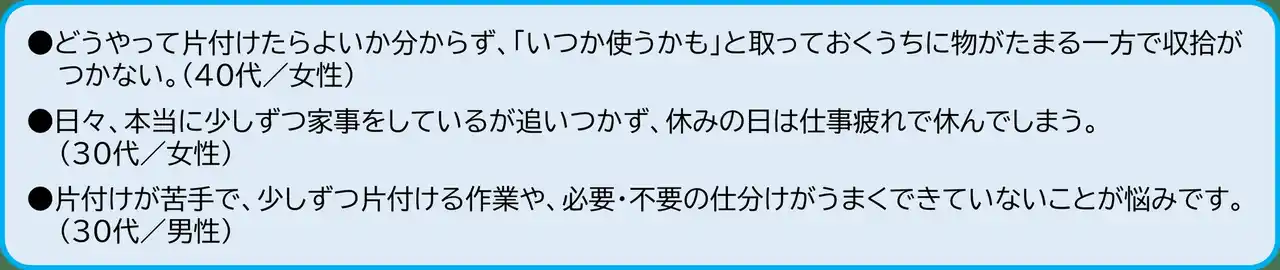 ●家が片付かない理由は、「面倒」「物が多い」「片付けが苦手」「時間がない」など |