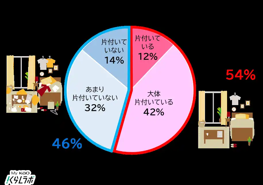 花王の調査では、家の中が『片付いている』と感じている人は54%(片付いている/大体片付いているの計)、『片付いていない』人は46%(片付いていない/あまり片付いていないの計)と、ほぼ半数ずつという結果でした。『片付いていない』と回答した人が片付いていないと感じる場所は、「リビング」58%、「クローゼット・収納」40%が上位で、家族みんなが毎日使う場所ほど、自然と物が集まりやすく「片付けても、すぐ散らかってしまう」と感じる人が多いようです。 |