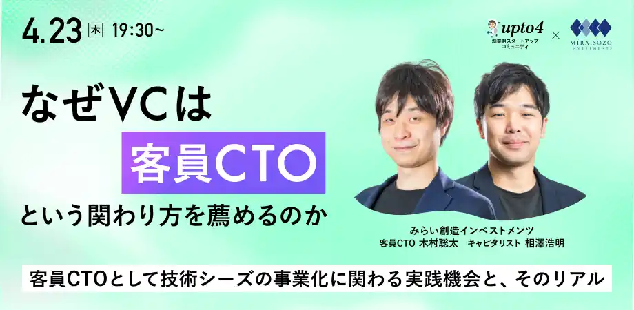 みらい創造インベストメンツは、「CTO供給・育成エコシステム」の推進に向けた具体施策として、CTO人材プール構築を目的としたオンライン説明会「なぜVCは『客員CTO』という関わり方を薦めるのか 」を、upto4株式会社との共催により開催いたします。 |