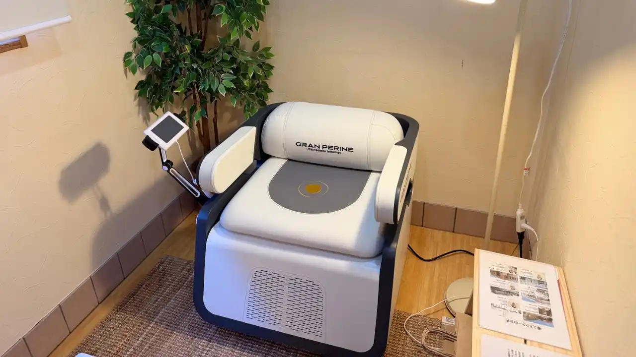 | 1階の死角エリアに設置された最新機器「グランペリネ」は、服を着たまま座るだけで骨盤底筋を鍛え、産後の尿漏れや下半身のたるみにアプローチします。カフェでドリンクをご注文いただいた方は、初回12分無料でご体験いただけます。子供服を選ぶ前後に、ホッと一息つきながらお試しください。 | |||
