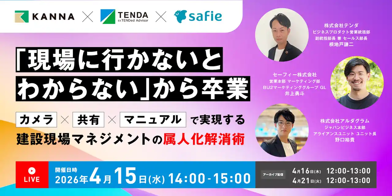 マニュアルトータルソリューションを提供し、企業の業務効率化を支援する株式会社テンダ(本社/東京都渋谷区、代表取締役会長兼社長CEO/薗部 晃、以下「テンダ」)は、株式会社アルダグラムおよびセーフィー株式会社と共催で、建設業界向けオンラインセミナー(ウェビナー)「『現場に行かないとわからない』から卒業 カメラ×共有×マニュアルで実現する建設現場マネジメントの属人化解消術」を2026年4月15日(水)に開催いたします。 本セミナーでは、建設現場における“属人化”の課題に対し、カメラ・情報共有・マニュアル化を掛け合わせた新しい現場マネジメント手法について、3社それぞれの知見をもとに解説します。 |