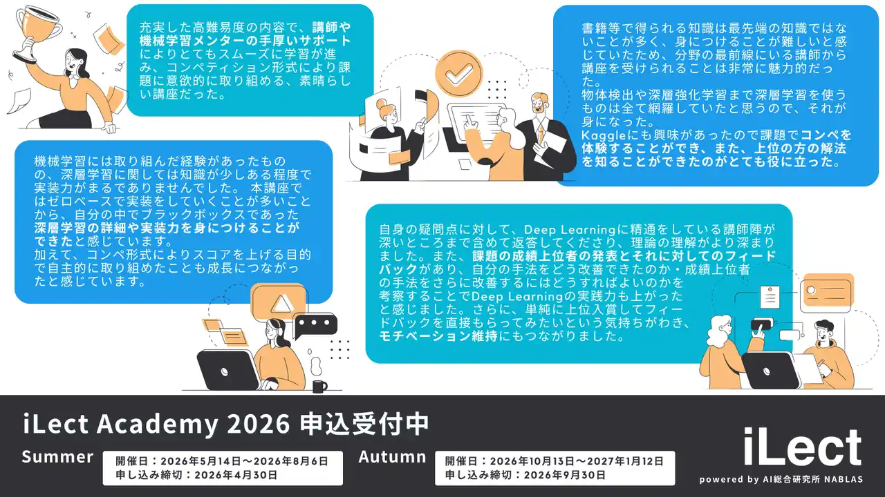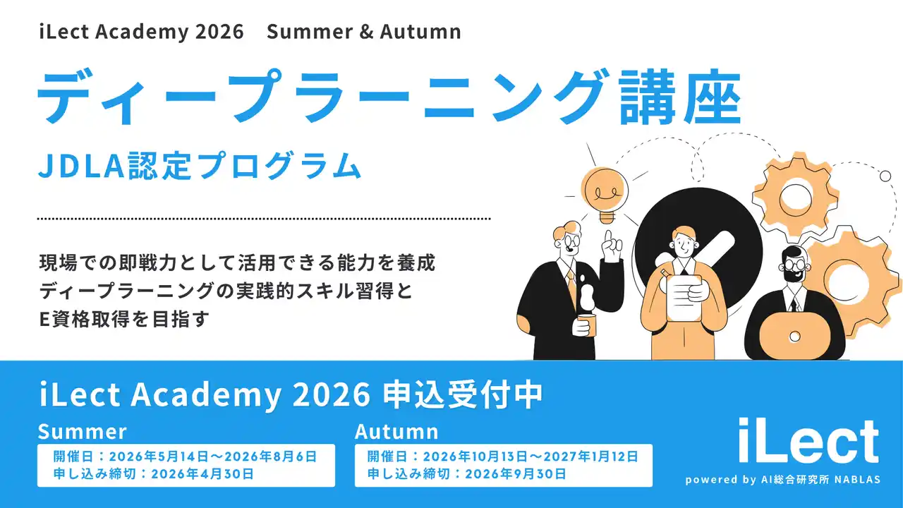 AI総合研究所として活動するNABLAS株式会社(本社 : 東京都文京区本郷、 代表取締役 所長 : 中山 浩太郎、 以下「当社」)が提供する実課題の解決を目的としたAI人材育成サービス iLect は、ディープラーニングの実践的スキル習得とE資格取得を目指す方向けの基礎講座「DL4E 2026 Summer & Autumn」の申し込み受付を開始いたしました。本講座は専門実践教育訓練給付制度の対象であり、要件を満たすことで受講料の最大80%が支給されます。 |