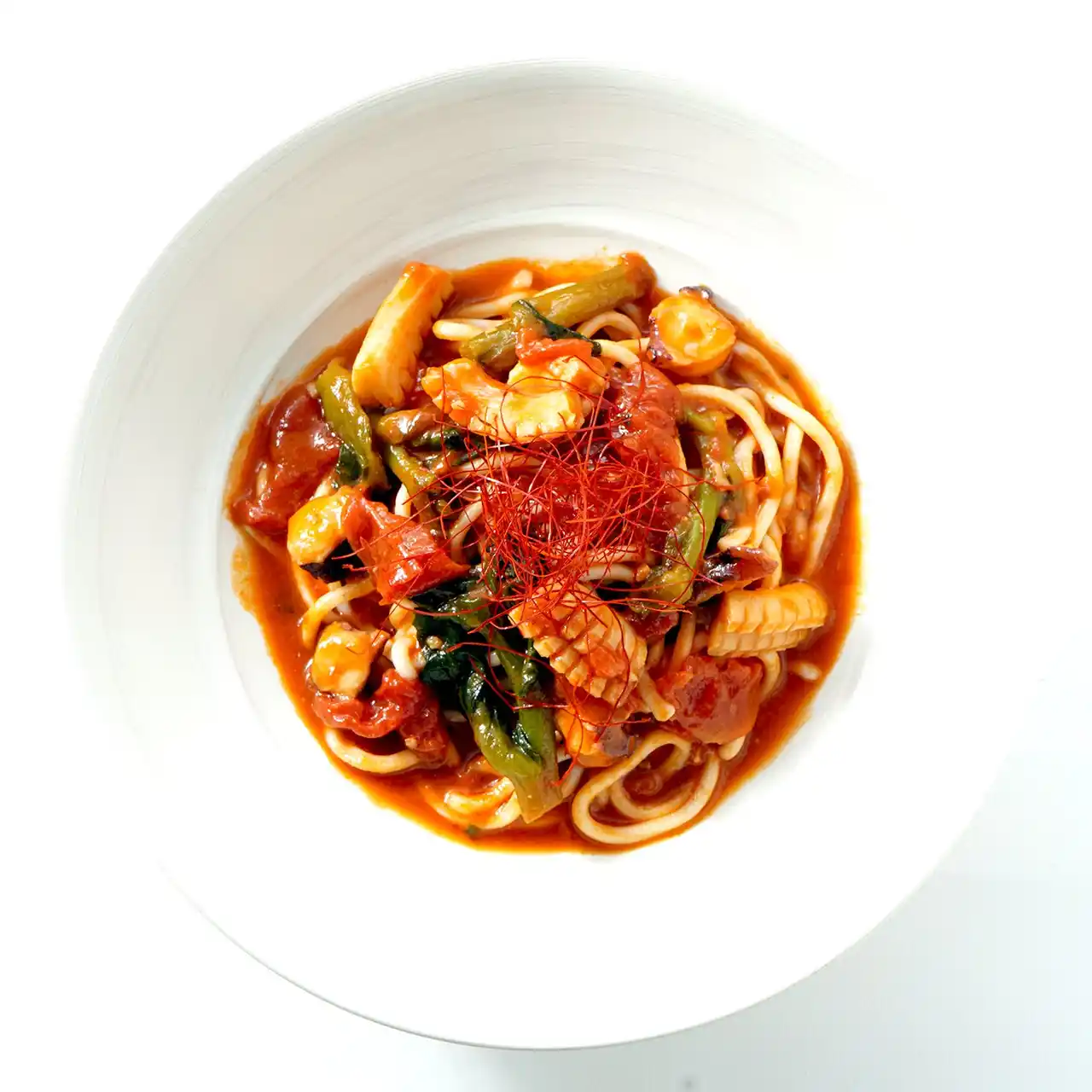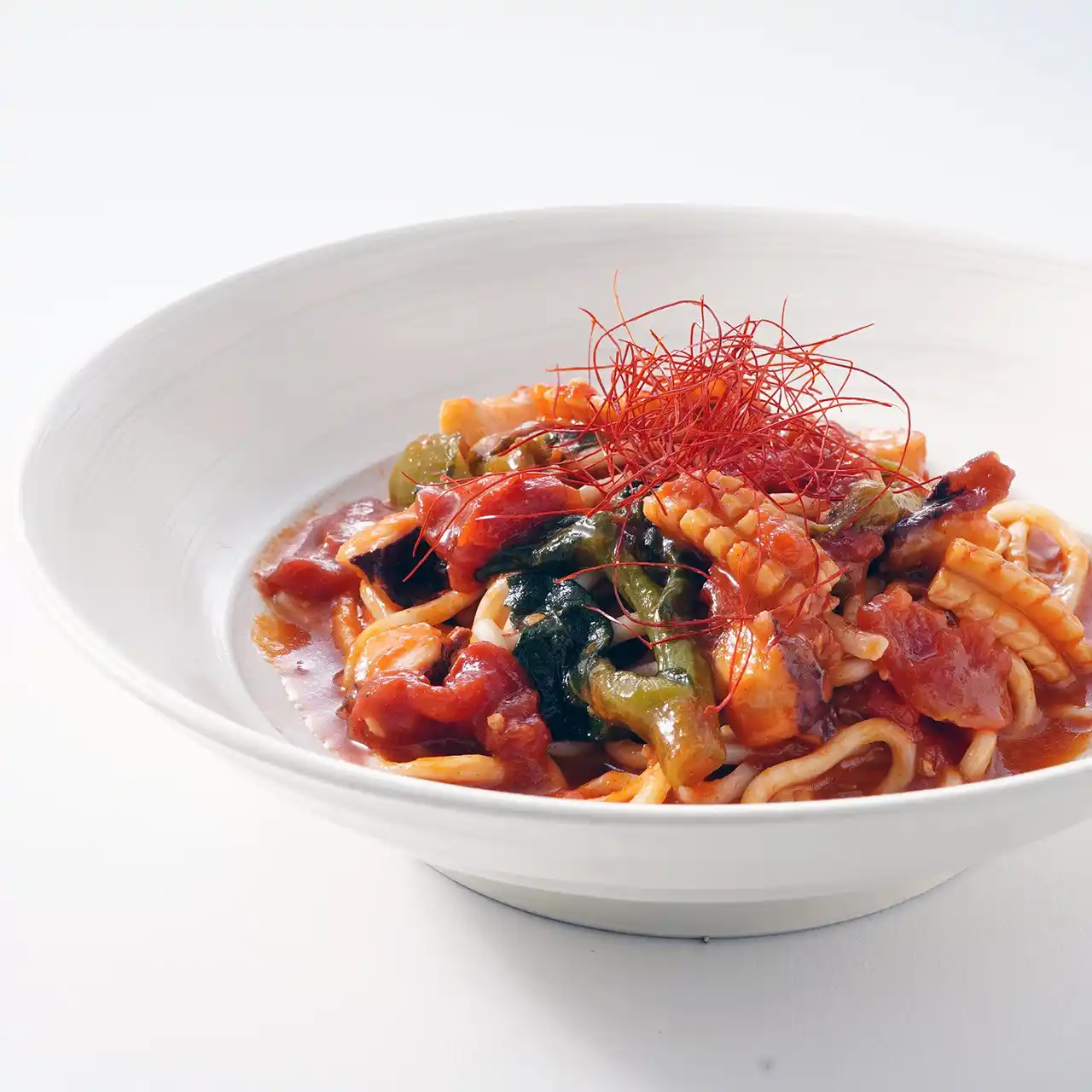 ぷりっとしたイカと旨味の濃いタコに、春を告げる菜の花を合わせ、にんにくと唐辛子で香り高く仕上げたガーリックチリパスタです。海鮮の旨味とオイルのコク、菜の花のほろ苦さが絶妙に重なり、春らしい軽さの中にしっかりとした満足感が広がる一皿です。 |