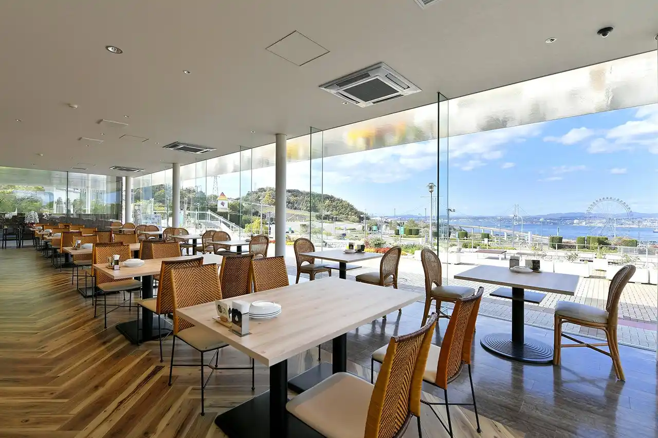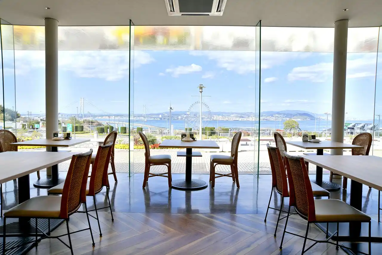 店内は総ガラス張り、明石海峡大橋のビューがどの席からも抜群! |