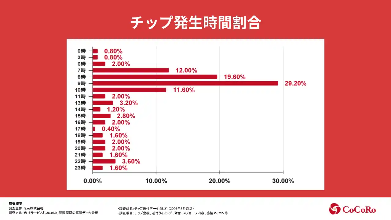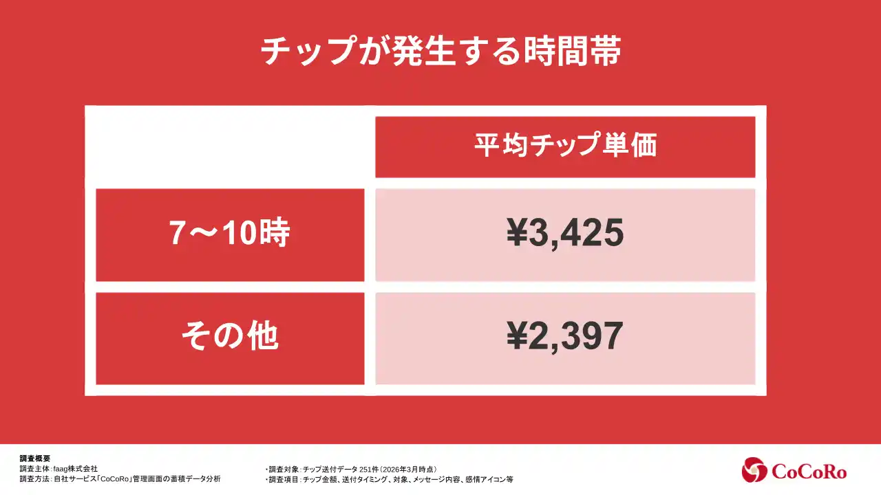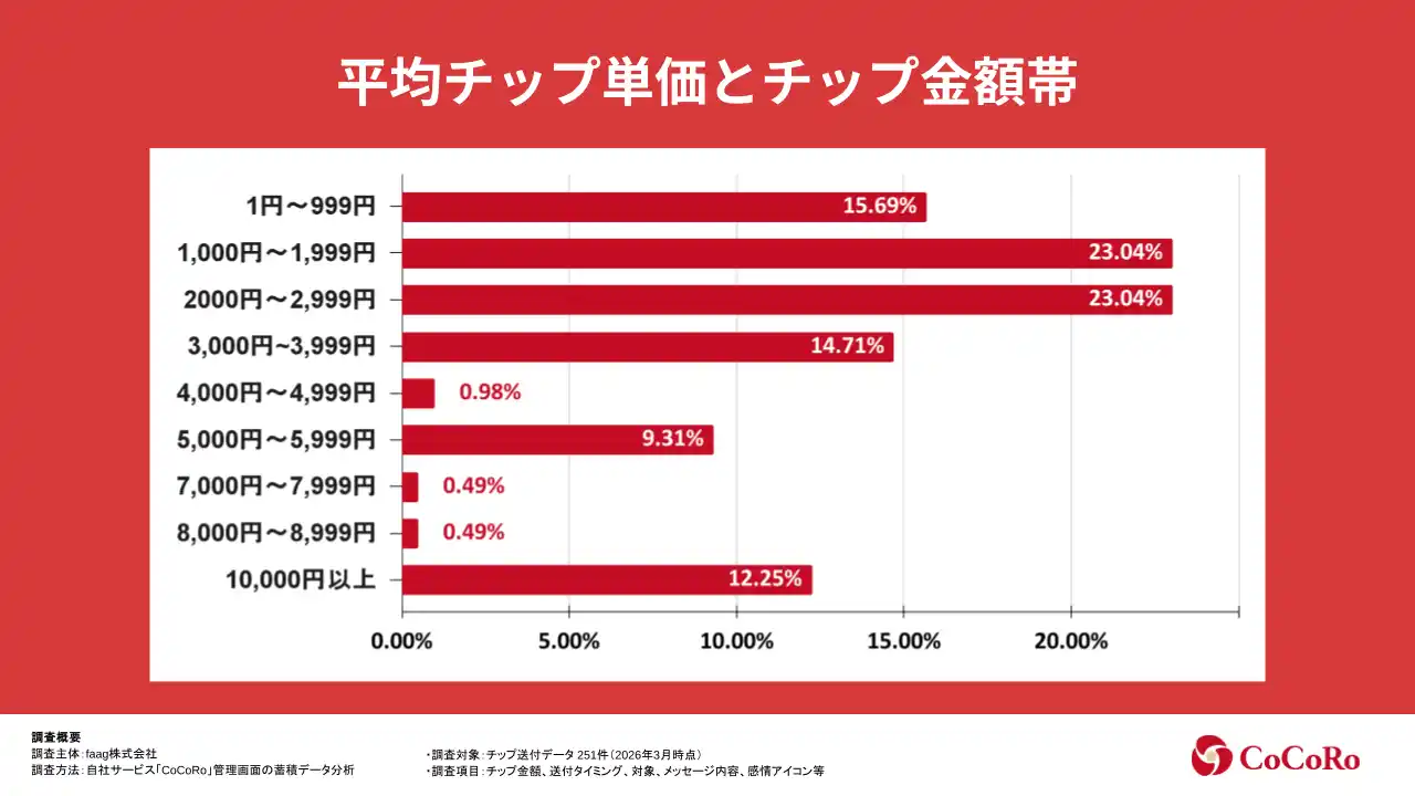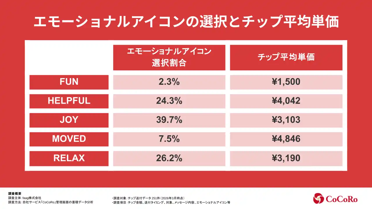 ■調査概要 ・調査主体:faag株式会社 ・調査方法:自社サービス「CoCoRo」管理画面の蓄積データ分析 ・調査対象:チップ送付データ 251件(2026年3月時点) ・調査項目:チップ金額、送付タイミング、対象、メッセージ内容、感情アイコン等 |