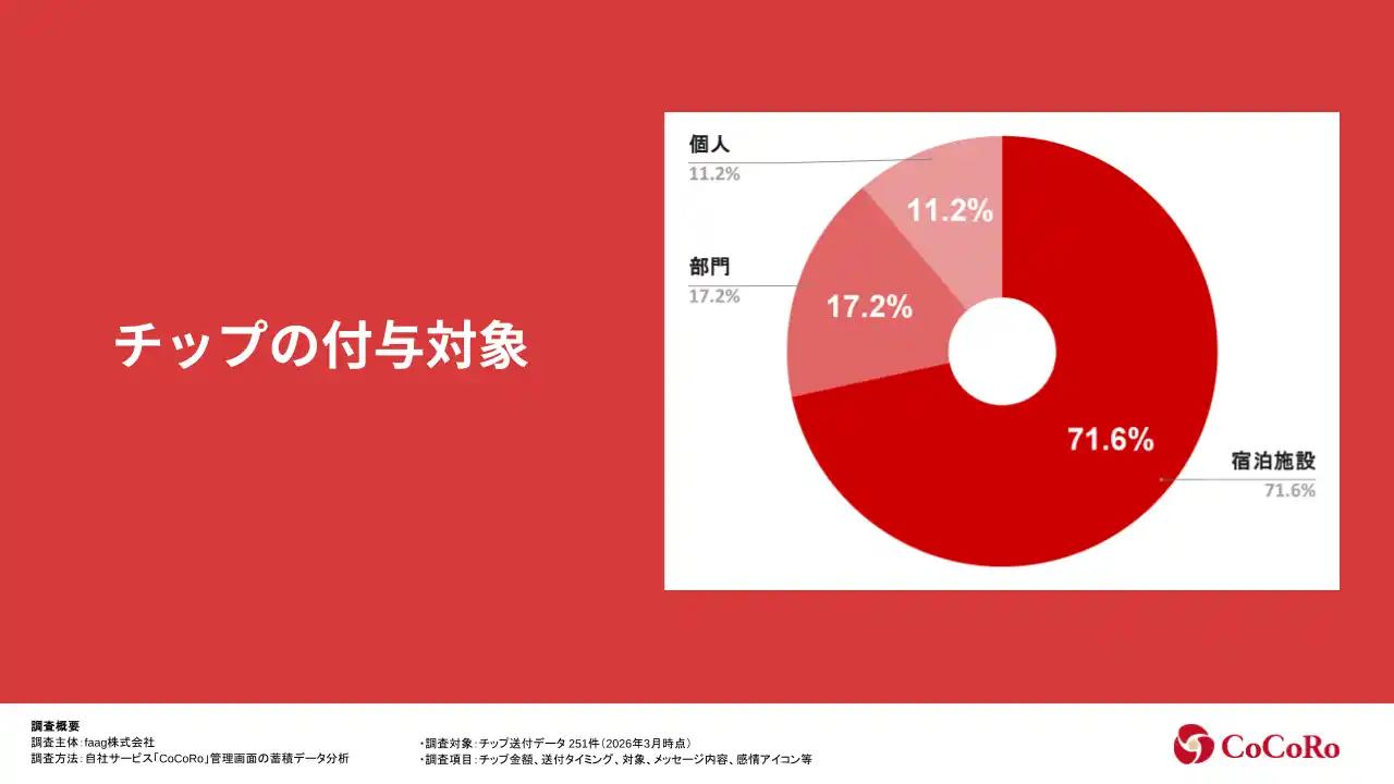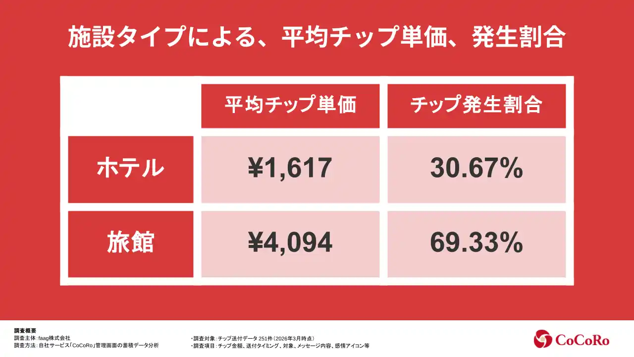| faag株式会社(本社:千葉県いすみ市、代表取締役:村田陽二)は、同社が提供するホテル・旅館特化型デジタルチップサービス「CoCoRo(ココロ)」に蓄積されたデータをもとに、宿泊施設におけるチップの実態について分析を実施。本リリースでは、電子チップの金額帯や発生タイミング、対象、メッセージ内容などの傾向をレポートにまとめました。 | |||