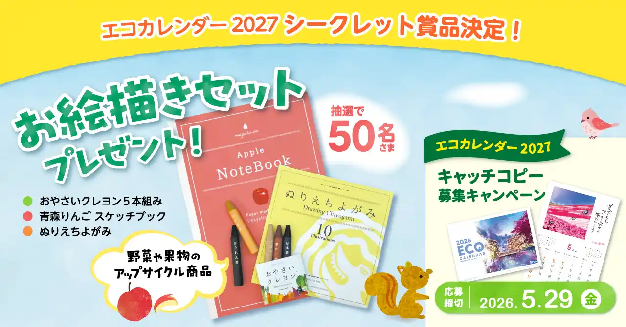 完成したカレンダーを応募者全員にプレゼントするほか、キャンペーンにご参加いただいた方へのプレゼント(特別賞・抽選で50名)として「シークレット賞品」をご用意しています。今年の「シークレット賞品」はアップサイクル文具を含む「お絵描き3点セット」(おやさいクレヨン、青森りんご スケッチブック、ぬりえちよがみ)に決定しました! |