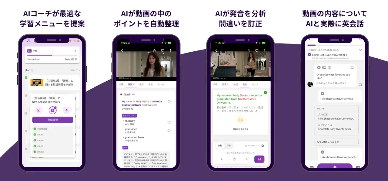 さらに、AI技術を活用した学習機能も充実しています。AIによる発音分析により自身の課題を可視化し、効率的な改善が可能です。また、AIチャットによる会話トレーニングや、AIコーチによる学習履歴・レベルに応じた最適な学習プランの提案により、継続的かつ効果的な学習を支援します。 |