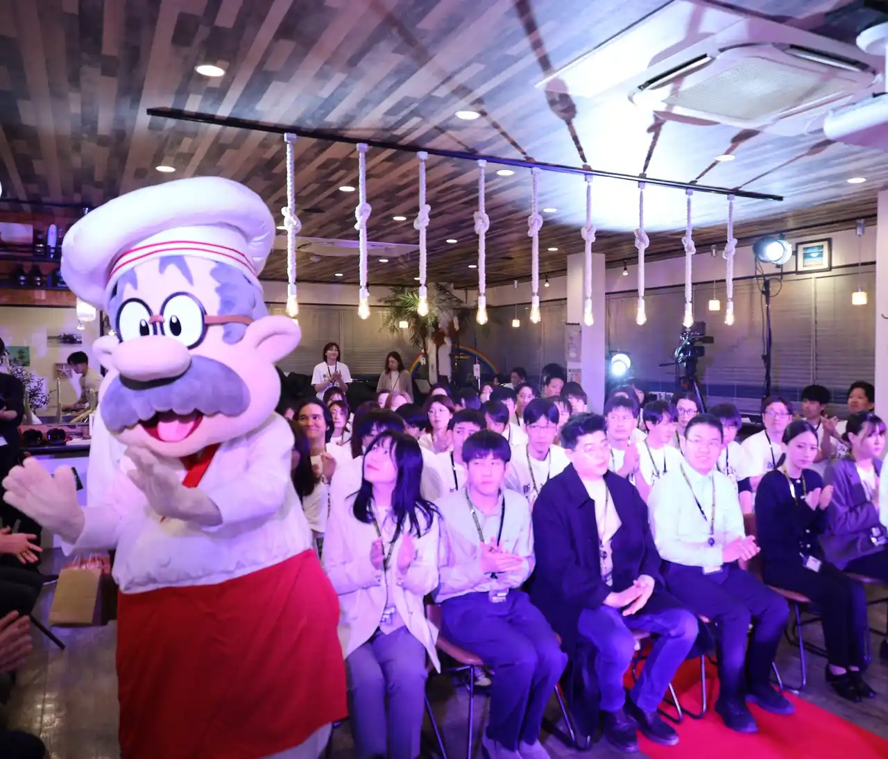 | 初めに当社の公式キャラクター「ヤミーおじさん」が登場すると、緊張した面持ちの新入社員を笑顔にしました。 | ||||||||||||||