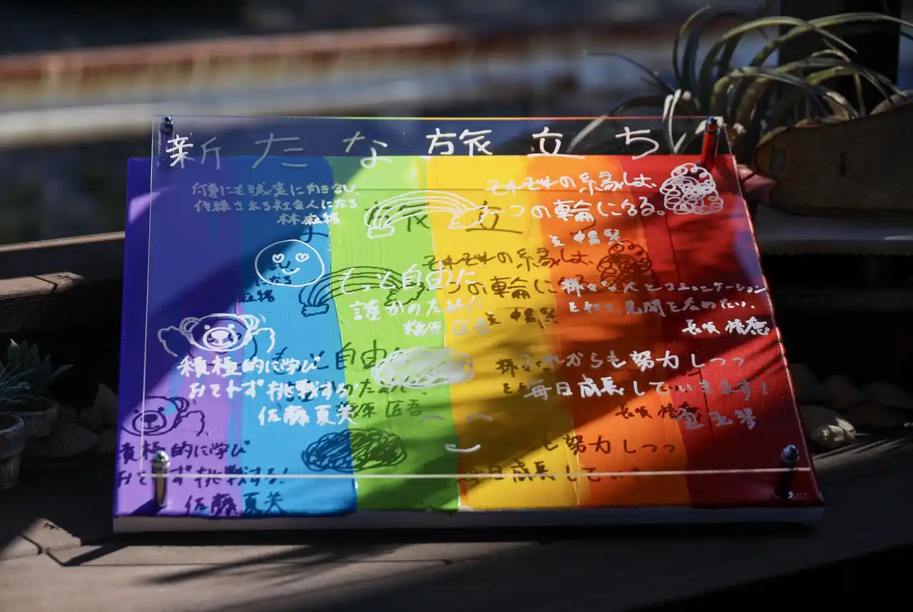 | さらに、今回初の試みとして、新入社員がアクリル板にこれからの意気込みを書き、真っ白なキャンパスに絵の具でカラフルな色付けを施すセレモニーを実施。色付けしたキャンパスにアクリル板を重ね合わせることで一人ひとりの個性や決意が重なり合い、ひとつの作品として表現されました。真っ白なこれからの社会人生活に、それぞれの想いや期待、決意を重ね、カラフルな線で未来を彩ることを表現しています。 | ||||||||||||||