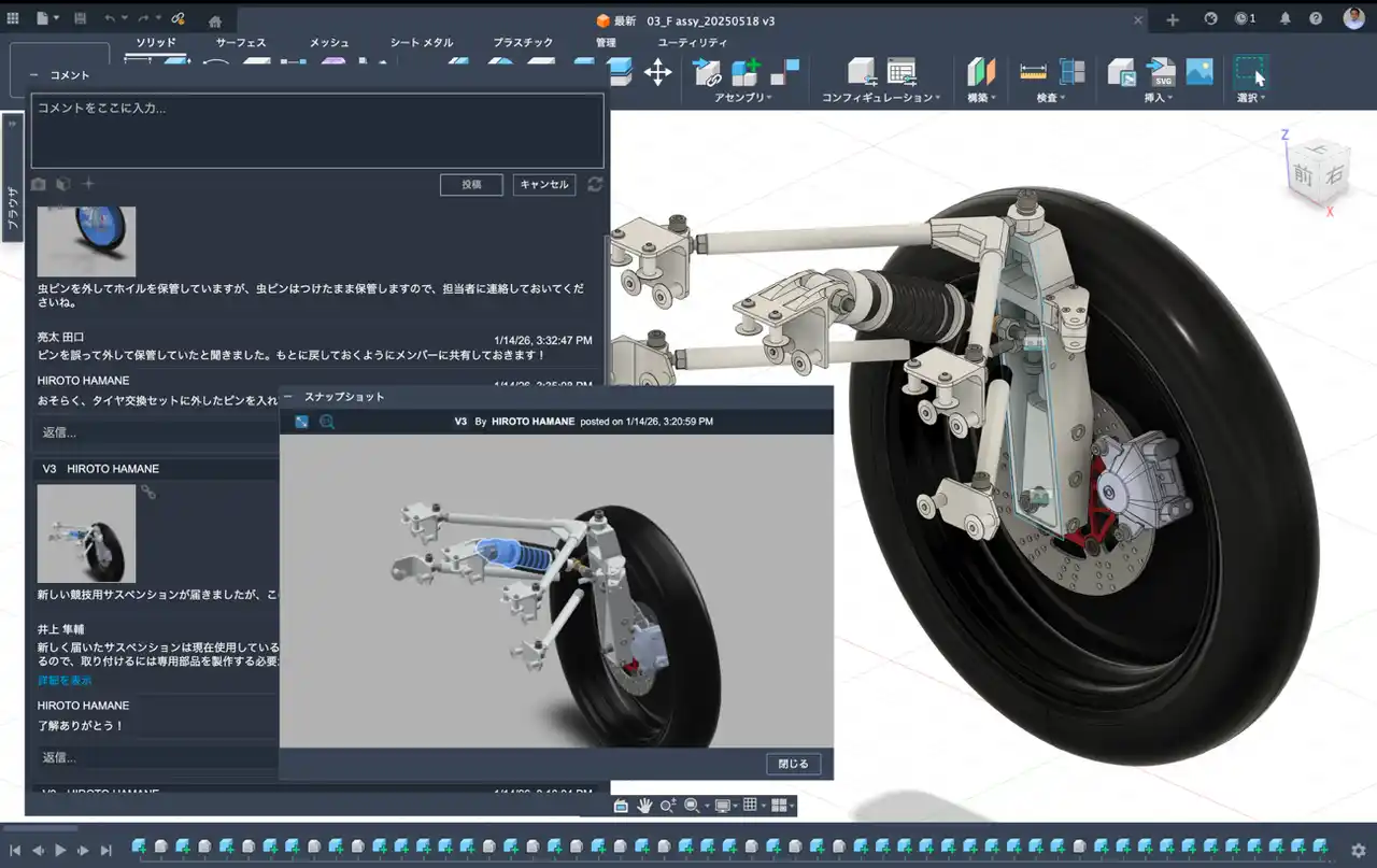 「Fusion を使うことで、設計から製造までを一つの流れで進めることができました。クラウド上でデータを共有しながら、メンバーや先生とリアルタイムでやり取りできるため、開発スピードが大きく向上しました」 |