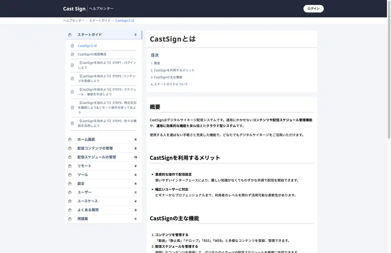従来は115ページのPDFマニュアルを一括提供していましたが、必要な情報にたどり着くまでに時間がかかるという声が多く寄せられていました。今回新設したヘルプサイトでは、機能別の記事構成、スタートガイド、利用シーン別のユースケース紹介、用語集を備え、ユーザーが自力で課題を解決できる環境を整備しました。これにより、当社サポート窓口への問い合わせ件数の削減も見込んでいます。 |