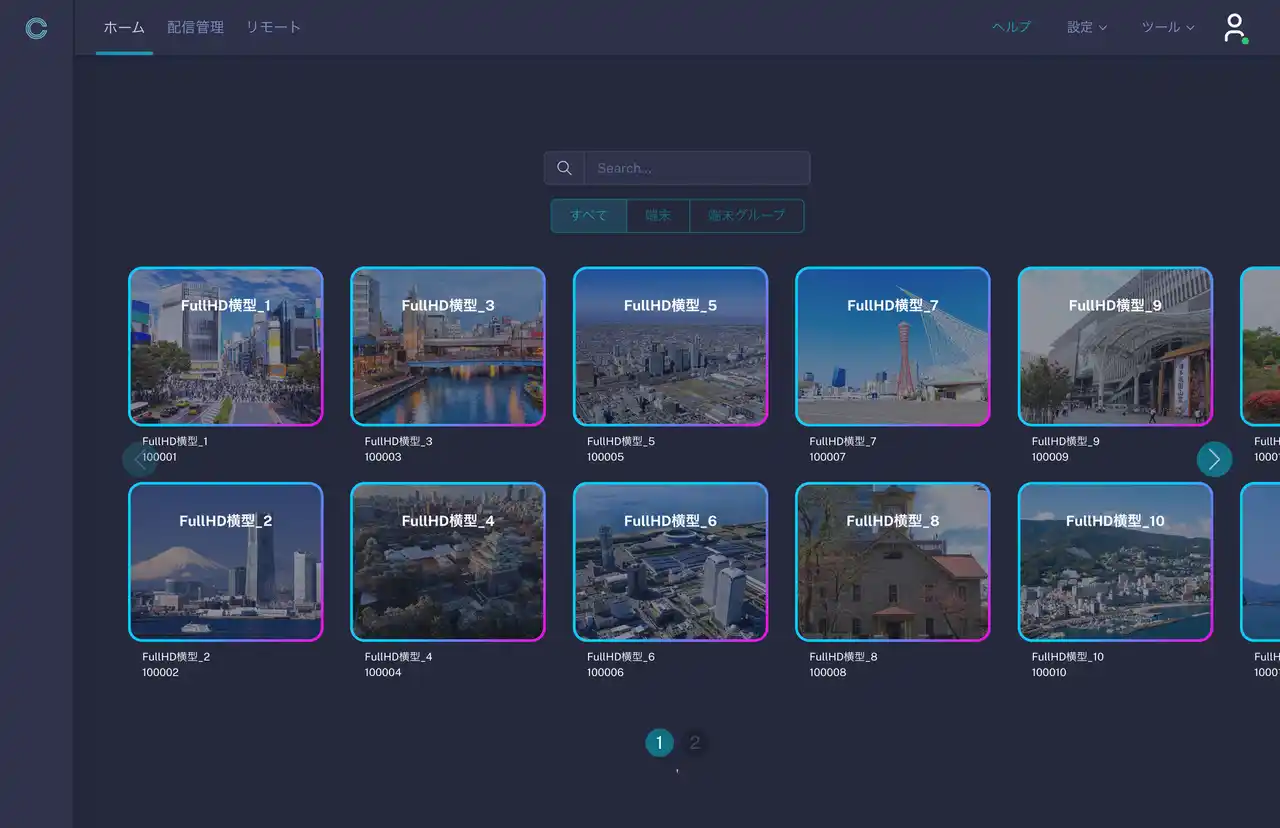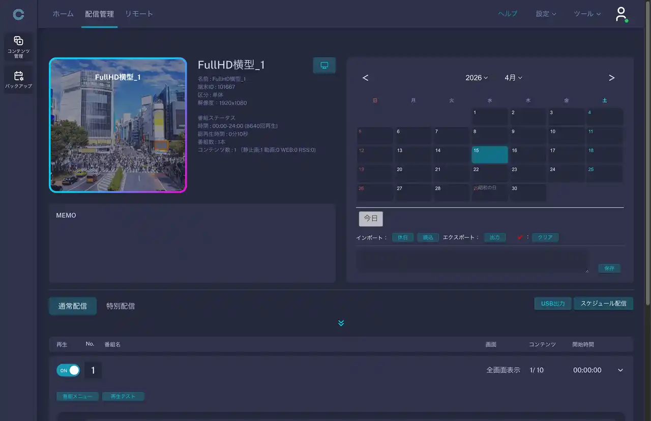 主な機能:コンテンツ配信(4K対応)、スケジュール管理、グループ一括配信、遠隔操作、死活監視 ほか |