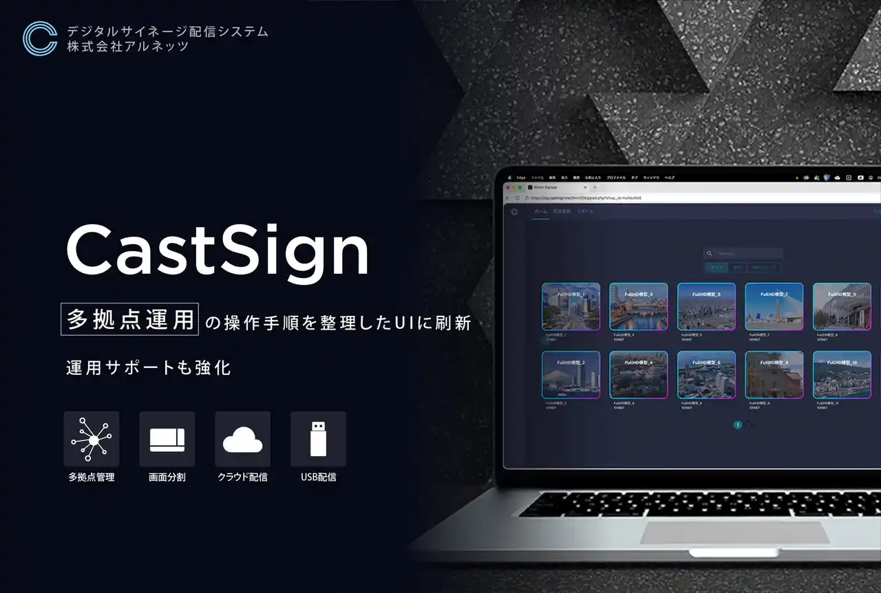 株式会社FRONTEO(東証グロース:2158)のグループ企業である株式会社アルネッツ(本社:神奈川県横浜市、代表取締役社長CEO 渡邉 輝明、以下「アルネッツ」)は、デジタルサイネージ配信システム「CastSign(キャストサイン)」のUIデザインを全面的にリニューアルし、あわせてヘルプサイトの提供を開始しました。 |