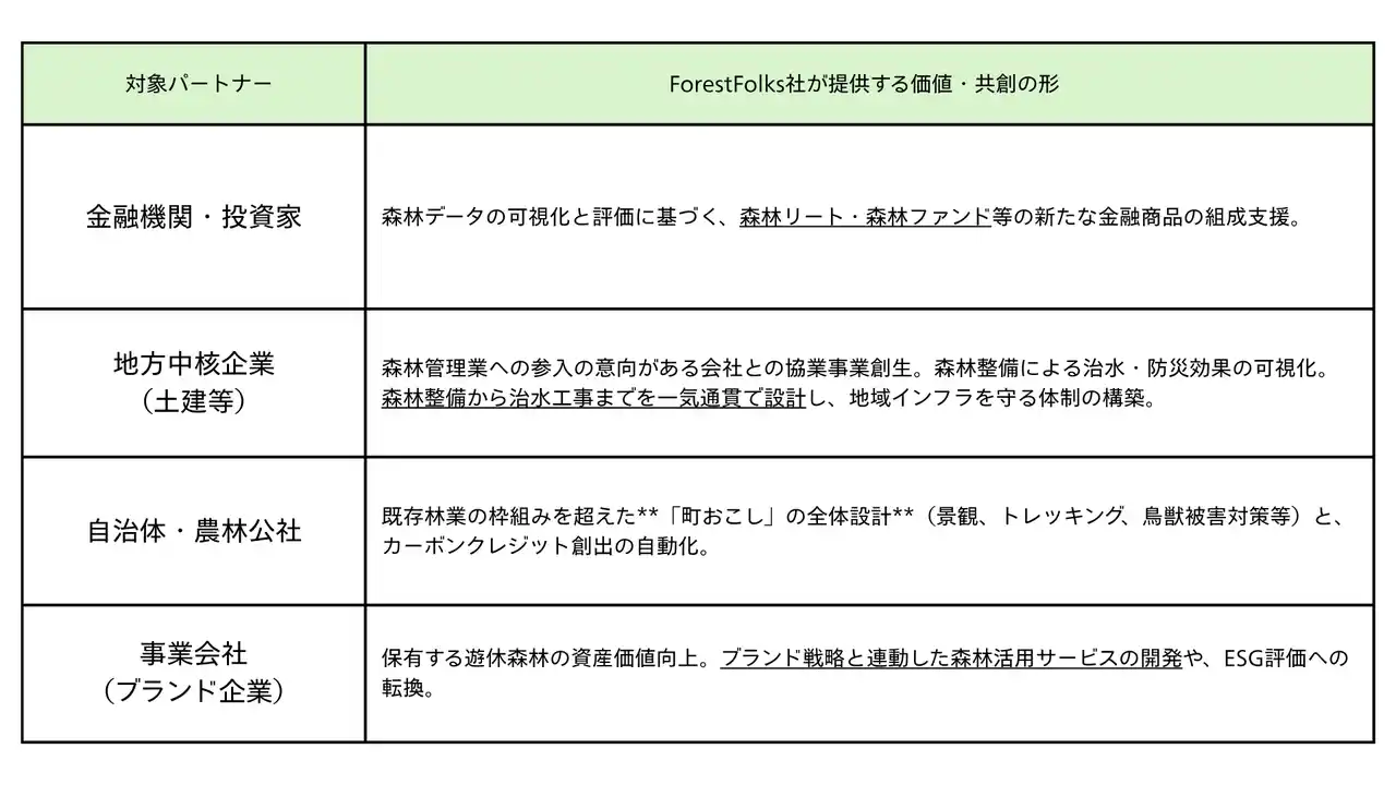 ForestFolks社では、今回の資金調達を機に金融機関・地方中核企業・自治体・農林公社等の森林に課題意識をお持ちの幅広いパートナーを募集しております。