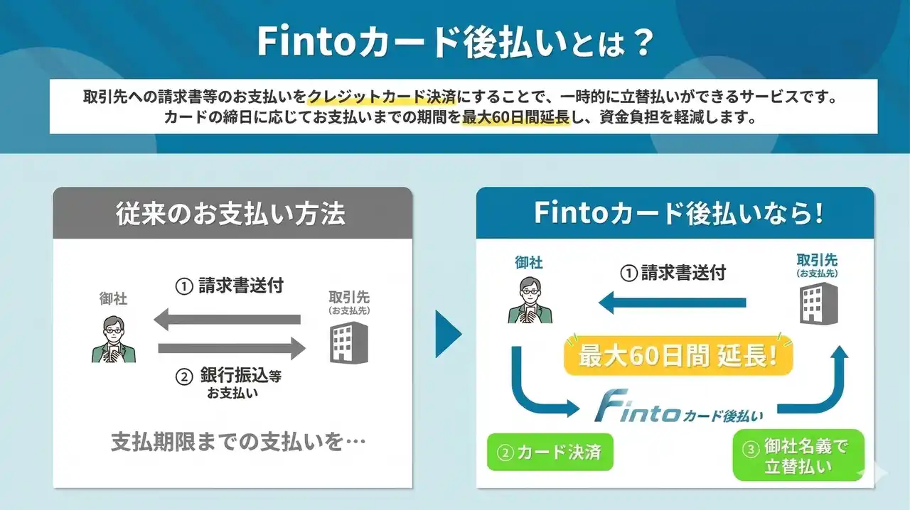 「Fintoカード後払い」は、銀行振込指定の請求書をクレジットカード支払い(請求書カード払い)に切り替えることで、実質的な支払い期限を延長し、企業のキャッシュフローを改善するサービスです。 |
