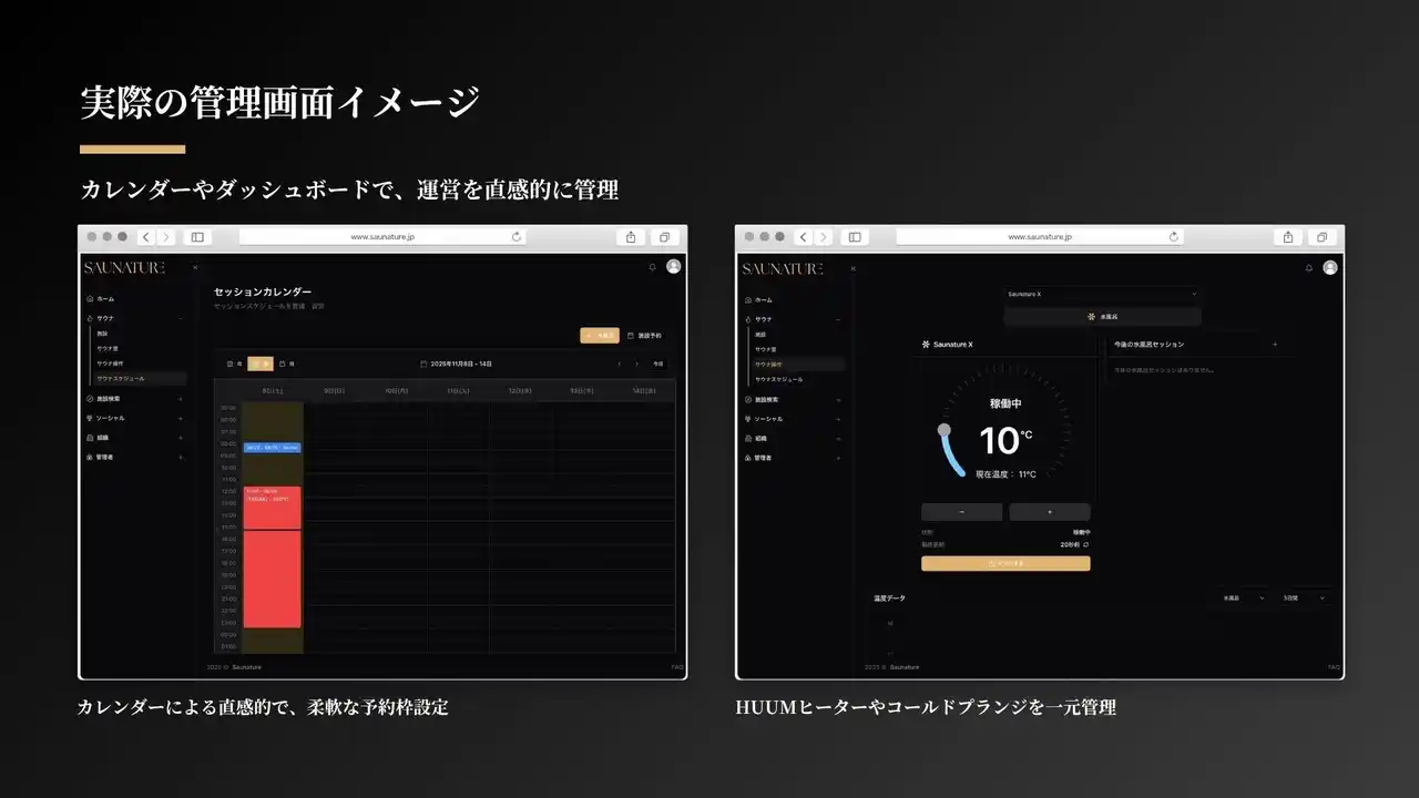 | SAUNATURE合同会社(本社:長野県北佐久郡軽井沢町、代表:オーリマンス・アルコ)は、サウナ施設専用の予約・経営管理システム『SAUNATURE(サウネイチャー)』の正式版を本日提供開始いたします。予約・決済に加え、エストニア発HUUM製サウナヒーターの遠隔操作までを一つのプラットフォームに統合した、業界唯一のサウナ施設専用SaaSです。 | ||||||||||