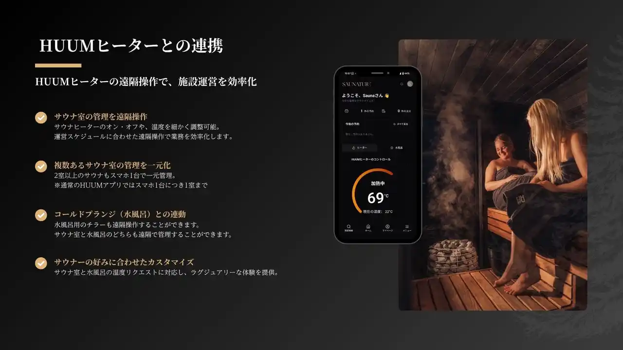 サウナ施設向けの予約システムは複数存在しますが、サウナストーブをソフトウェアから操作できる予約システムは、SAUNATUREだけです。 同社はサウナストーブとキャビンのハードウェア販売事業を基盤に持つからこそ、HUUM製ヒーターとのネイティブ連携を実現。 他社が市場規模の判断からサウナに特化しない中、ハードウェアからソフトウェアまでを一貫で提供できる唯一のポジションを確立しています。 ヒーターのオン・オフ・温度調整を遠隔操作。 複数サウナ室もスマホ1台で一元管理(通常のHUUMアプリは1台につ1室まで)。 コールドプランジ(水風呂)も遠隔操作可能。 予約スケジュールと連動した自動運転で、待機電力の削減や準備・閉店作業の効率化を実現します。 |
