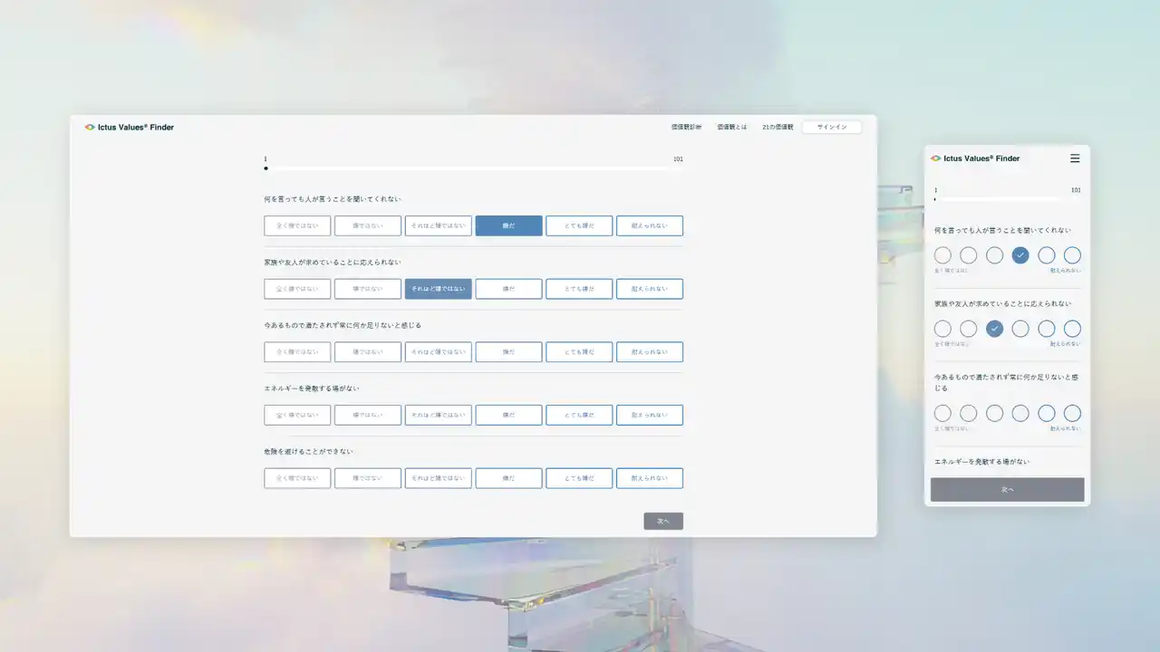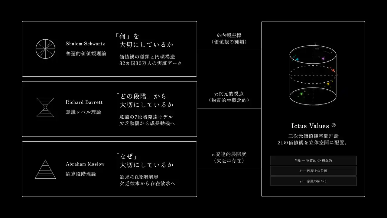 「なぜこの人とは話が噛み合わないのか」「なぜ部下のモチベーションが上がらないのか」--組織の中で生じる違和感や摩擦の多くは、個人の価値観の違いに根ざしています。 しかし、既存の性格診断やエンゲージメント調査は、行動パターンや満足度を測定するものであり、その人が「本当に大切にしているもの」を構造的に明らかにするものではありませんでした。 Ictus Values(R)