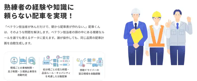 「配車くん」は、産業廃棄物業界における人手不足や配車業務の属人化といった課題に対応するために開発されたサービスです。これまでベテラン担当者の経験や判断に依存しやすかった配車業務を支援し、業務の標準化と効率化を図ることで、安定した現場運営の実現を目指します。 |