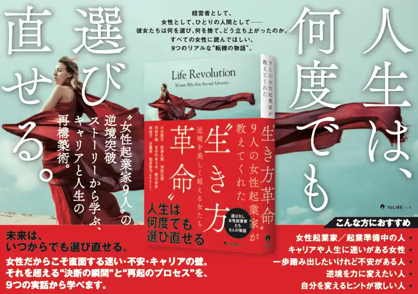 Genimo合同会社(本社:東京都、代表:大澤麻実)が運営する、長野県を拠点とする出版レーベル「YoLME出版(ヨルメ出版)」は、女性起業家9名の実話をまとめた書籍『9人の女性起業家が教えてくれた“生き方革命” ―逆境を美しく超える女たち―』を2026年4月7日に発売しました。 女性起業家9名の実体験をもとに構成されたストーリー形式の一冊で、逆境から人生を選び直し、キャリアを再構築してきた女性たちのリアルな歩みを収録しています。 4月9日より丸善丸の内本店での展開を予定しており、紀伊國屋書店新宿本店でも順次展開を予定しています。 |