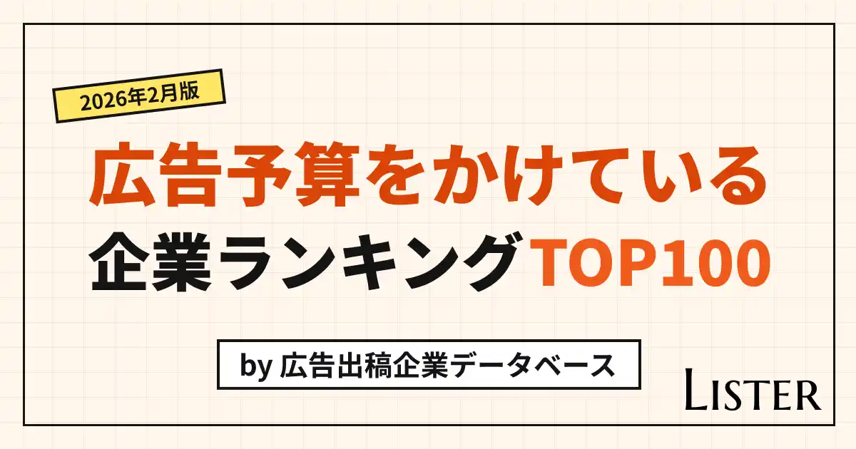 株式会社Lister(本社:東京都千代田区、代表取締役:永良慶太)は、Web広告に予算をかけている企業一覧を独自にまとめたデータベースとしてサービス展開している「広告出稿企業データベース」より、「広告予算をかけている企業ランキングTOP100【2026年2月版】」を発表しました。本リリースでは、BtoB領域のWeb広告市場にセグメントを絞り、広告出稿量の多い企業をランキングとしてまとめています。