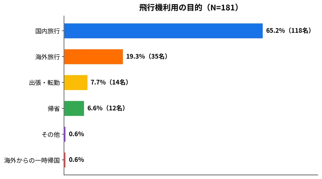 飛行機利用経験者181名に利用目的を尋ねたところ、「国内旅行」が65.2%で最多、次いで「海外旅行」が19.3%、「出張・転勤」が7.7%、「帰省」が6.6%でした。 |