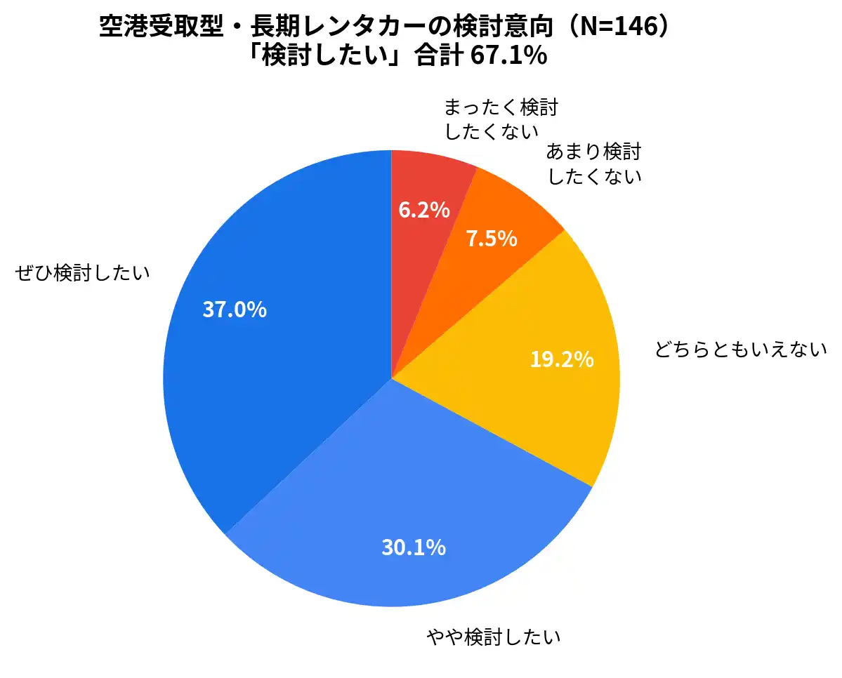 「空港で受け取り、滞在中ずっと利用でき、空港や自宅・駅で返却できる長期レンタカーがあれば検討しますか?」と尋ねたところ、「ぜひ検討したい」(37.0%)と「やや検討したい」(30.1%)を合わせて67.1%が検討意向を示しました。 |