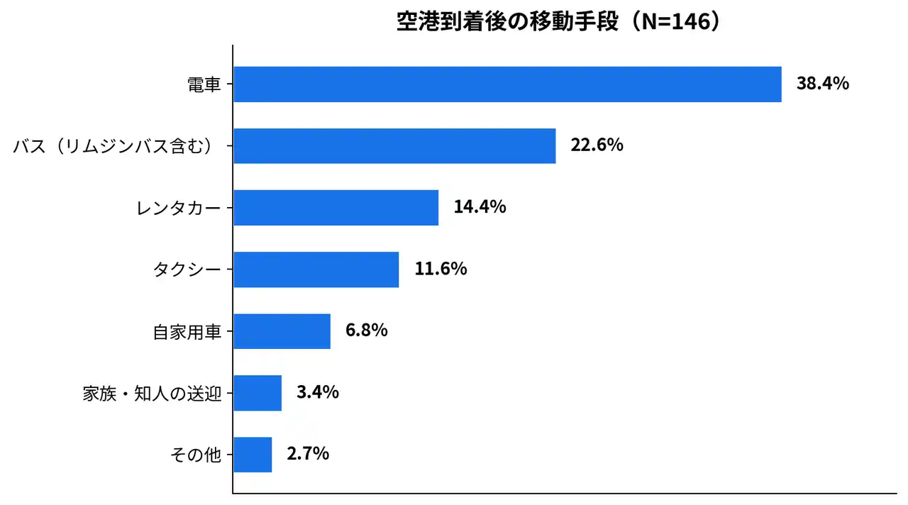 空港到着後の移動手段は「電車」が38.4%で最多。次いで「バス(リムジンバス含む)」が22.6%、「レンタカー」が14.4%、「タクシー」が11.6%と続きます。 |