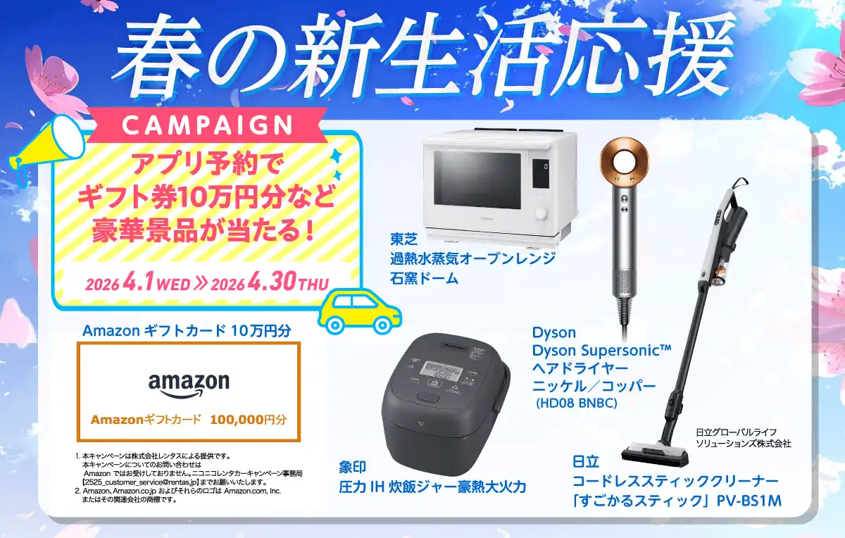 株式会社レンタス(本社:神奈川県横浜市、代表取締役社長:木村孝広)が展開している日本最大規模のレンタカーネットワーク「ニコニコレンタカー」は、2026年4月1日(水)~4月30日(木)の期間中に公式アプリ「ニコパス」でレンタカーをご予約・ご利用いただいた方の中から、抽選で5名様に豪華景品が当たる「春の新生活応援キャンペーン」を開催します。 |