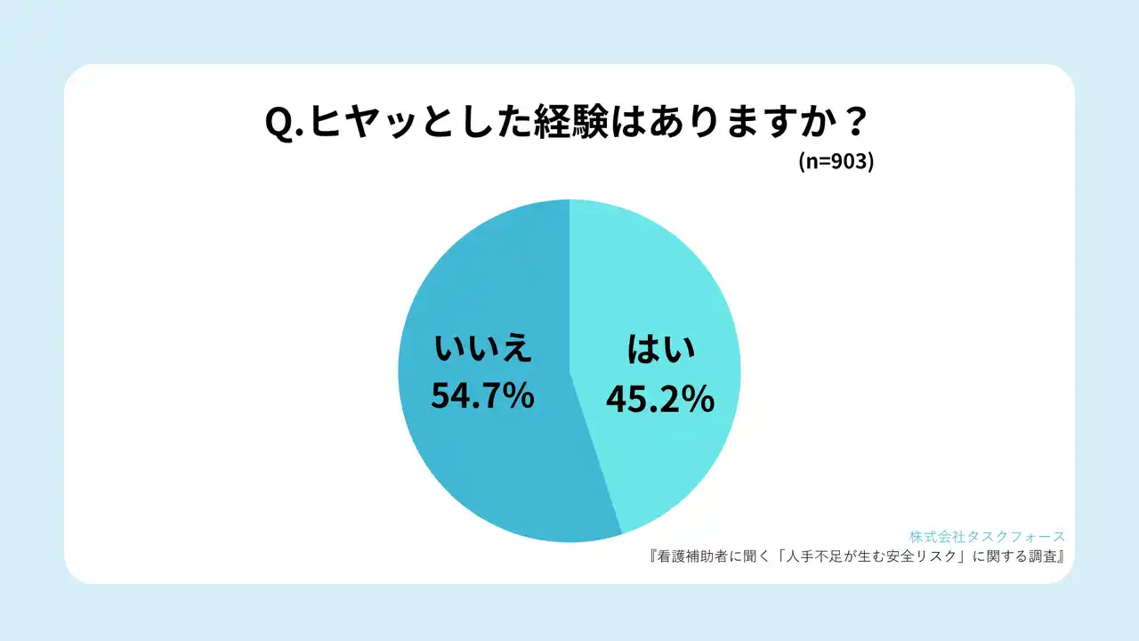 調査結果からは、医療現場において、約半数である45.2%の看護補助者が「ヒヤッとした経験」をしていることが判明しました。また、ヒヤッとした経験の内容として、人手不足が要因となるケースが確認でき、人手不足によって実際に危険を感じる場面が生じていることが明らかになりました。 |