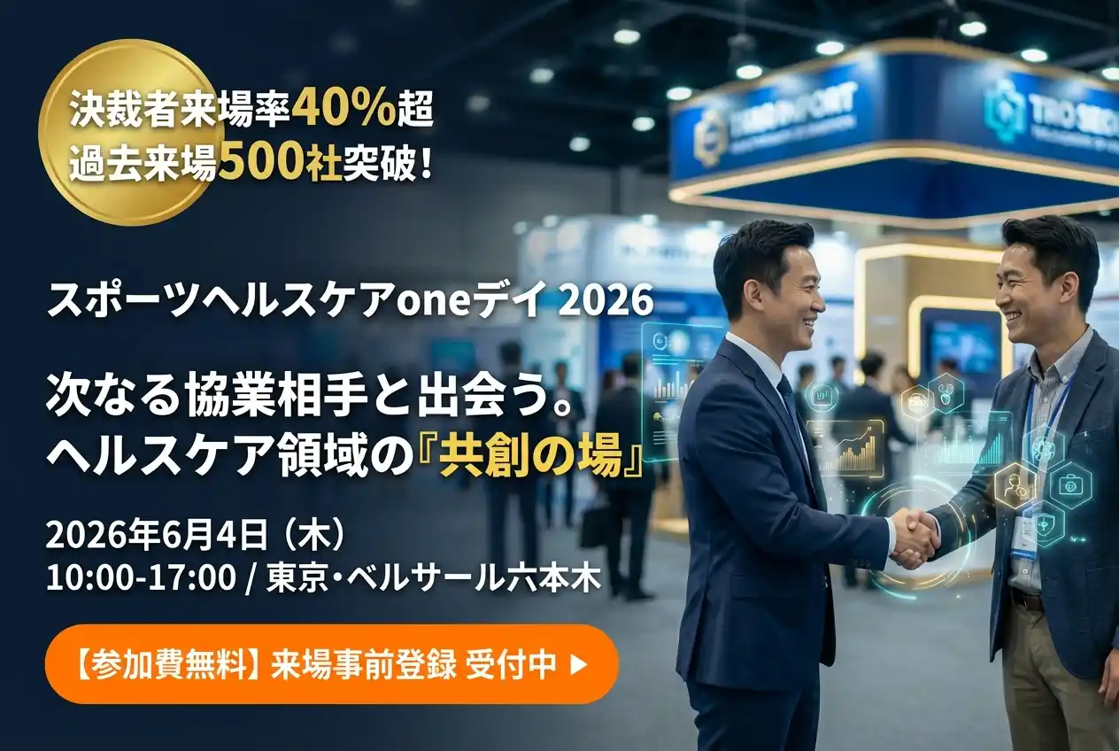 株式会社Keep up(本社:東京都港区、代表取締役:朝倉新)は、ヘルスケア・スポーツビジネスに特化した完全BtoBマッチングイベント「スポーツヘルスケアoneデイ2026」を、2026年6月4日(木)に東京・ベルサール六本木にて開催いたします。 それに伴い、本日より公式ウェブサイトにて、参加費が無料となる「来場事前登録」の受付を開始いたしました。 |