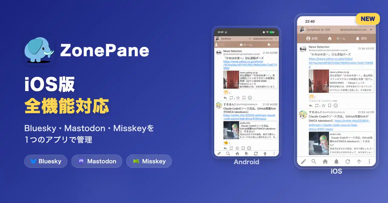 株式会社ペーンクラフト(北海道札幌市、代表取締役:竹内裕昭)は、累計3万ダウンロードを突破したマルチSNSクライアントアプリ「ZonePane(ぞーぺん)」のiOS版 v5を公開しました。今回のアップデートにより、最も要望の多かった「自動更新」機能に対応し、iOS版の「完成」となりました。あわせてAndroid版もv41を同日リリースし、両プラットフォームで新プラン「プロプラン」を導入しました。 |
