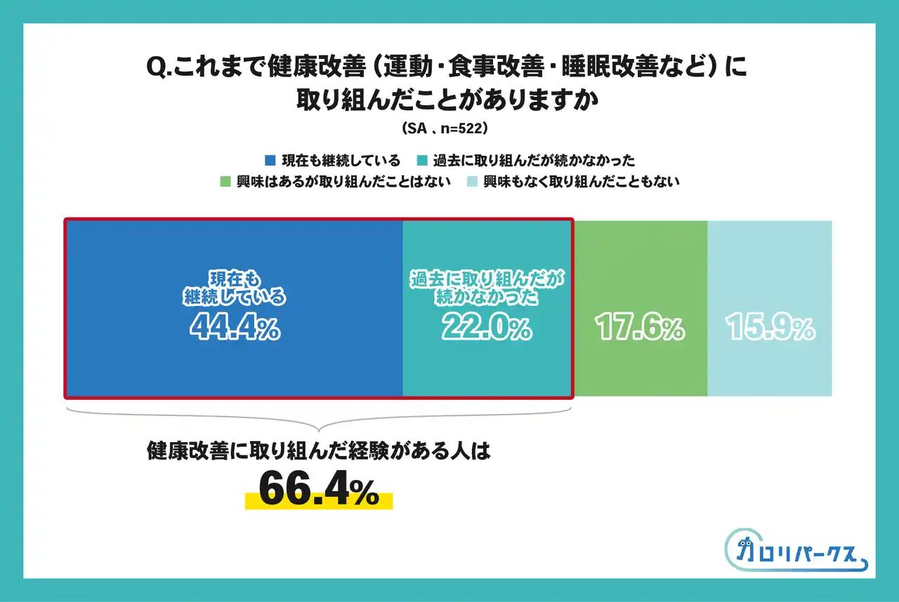 | 健康改善に取り組んだ経験がある人は全体の6割超にのぼる一方で、継続できていない層も一定数存在することが明らかになりました。具体的には、「現在も継続している」が44.4%で最多となり、「過去に取り組んだが続かなかった(22.0%)」、「興味はあるが取り組んだことはない(17.6%)」と続きました。 | ||||||||||||||||||||||||||||||||||||||||