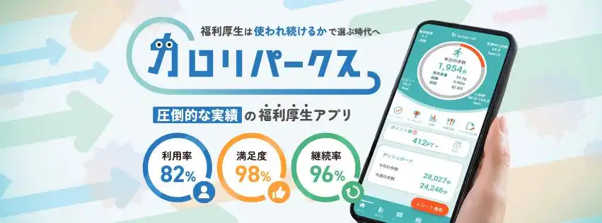 | 「カロリパークス」は、スマートフォンアプリを活用した福利厚生サービスです。従業員の健康増進をサポートする機能と、日々の生活を豊かにするサービスを組み合わせることで、企業の健康経営をサポート、従業員の満足度と定着率向上に貢献します。導入企業では、利用率82%・満足度98%・継続率96%(2024年自社調べ)という高い実績を誇り「導入しただけで終わらせない、“届く福利厚生”」として注目を集めています。 | ||||||||||||||||||||||||||||||||||||||||