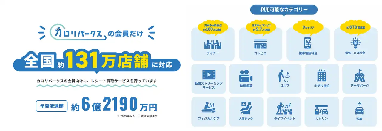 | 会員を対象に、日常生活で使う光熱費・通信費・コンビニなどのレシートをマーケティング調査として買い取る仕組みを導入(※給与所得には該当しません)。年間流通額は約6億2,190万円(2025年実績)と、多くのユーザーに活用されています。対象は全国約131万店舗・施設あるため、 「特別な施設を探さなくても、いつものお店で使える」実用性の高さが支持されています。 | ||||||||||||||||||||||||||||||||||||||||