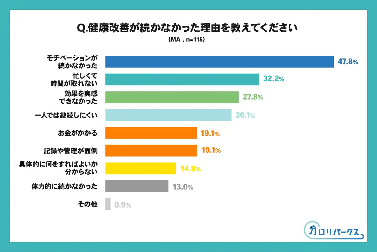 | 健康改善が続かない理由として以下が上位に挙がりました。 | ||||||||||||||||||||||||||||||||||||||||