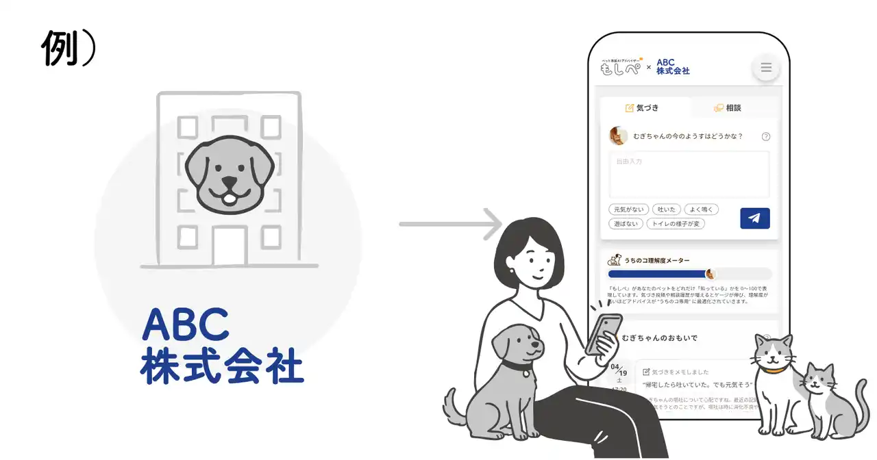 事業者が提供する既存のペット関連サービスに、24時間365日対応のAI相談窓口『もしぺ』を組み込むことで、顧客満足度およびロイヤリティを向上させる新たな付加価値を提供します。 |
